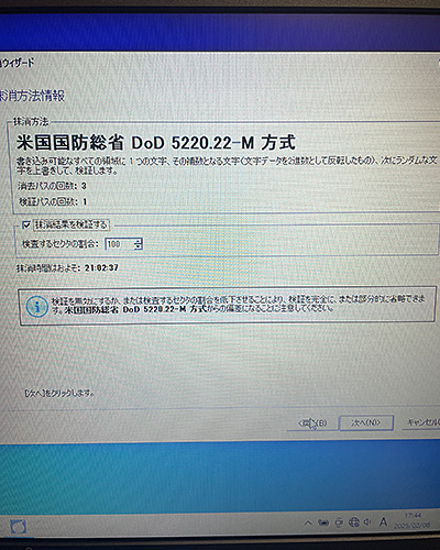 米国国防総省基準のHDD消去ソフトが稼働しているところ